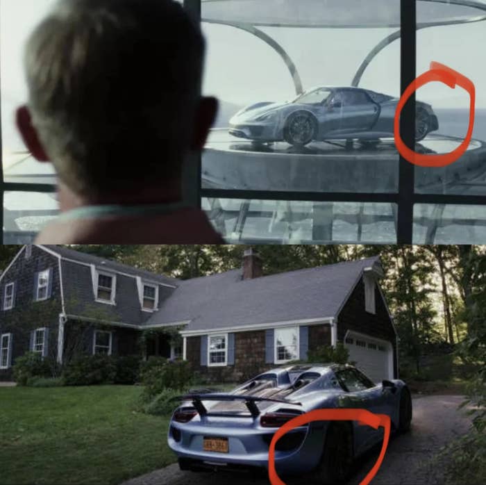 3. En Glass Onion: A Knives Out Mystery, Al coche de Miles le falta una pieza trasera en un flashback. Le falta la misma pieza cuando cae por el tejado casi al final de la película, a pesar de tenerla esa misma noche.
