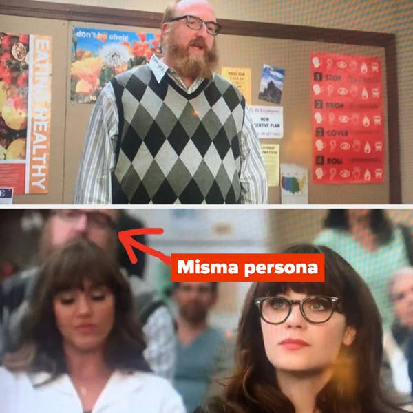 6. En New Girl, hay una escena en la que un personaje secundario está hablando, entonces la cámara corta a Jess escuchando... excepto que el mismo personaje secundario está en el fondo.